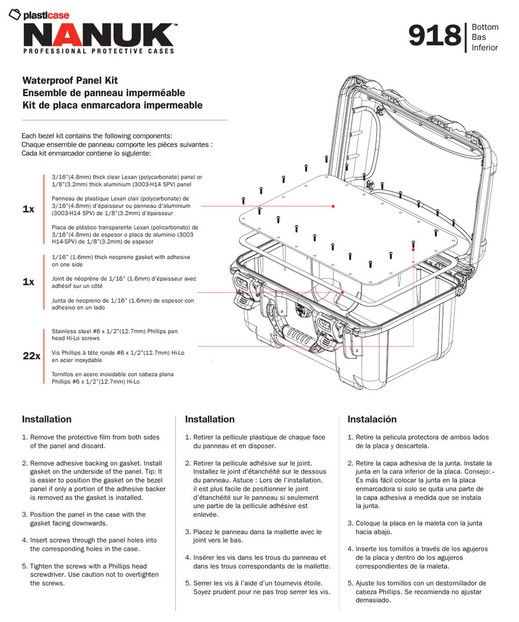 A Lexan panel kit can easily be added to any of the Nanuk cases thanks to the integrated bezel system. The Lexan panel kit is contoured by a 3/16″ thick polycarbonate panel with stainless steel mounting screws and an adhesive backed die-cut waterproofing gasket.