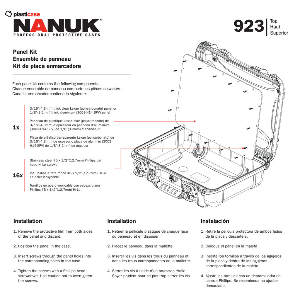 A Lexan panel kit can easily be added to any of the Nanuk cases lid thanks to the integrated bezel system. The Lexan panel kit is contoured by a 3/16″ thick polycarbonate panel with stainless steel mounting screws. The top panel is installed on the lid of the case.