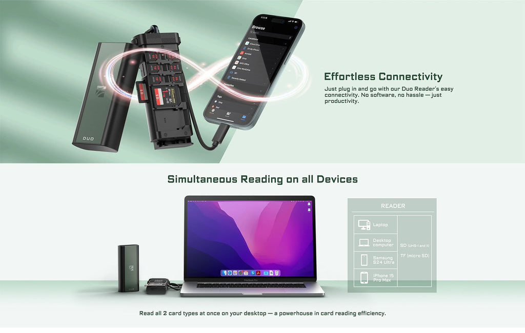 - High-Speed Data Transfer: Equipped with a Type-C port, the Duo Reader enables fast data transfer to Type-C enabled devices, streamlining your workflow without the need for additional apps.