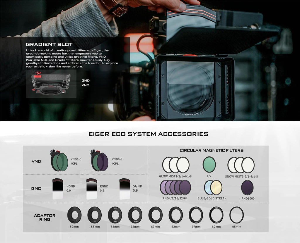 - Future-proof: With Eiger Matte Box, you no longer need to worry about choosing the correct filter thread size. This versatile system is designed to be compatible with the lens up to 95mm with included adaptors from 67mm to 82mm, with an option to purchase an adaptor for 52mm, 55mm, 58mm, 62mm, and 95mm separately.