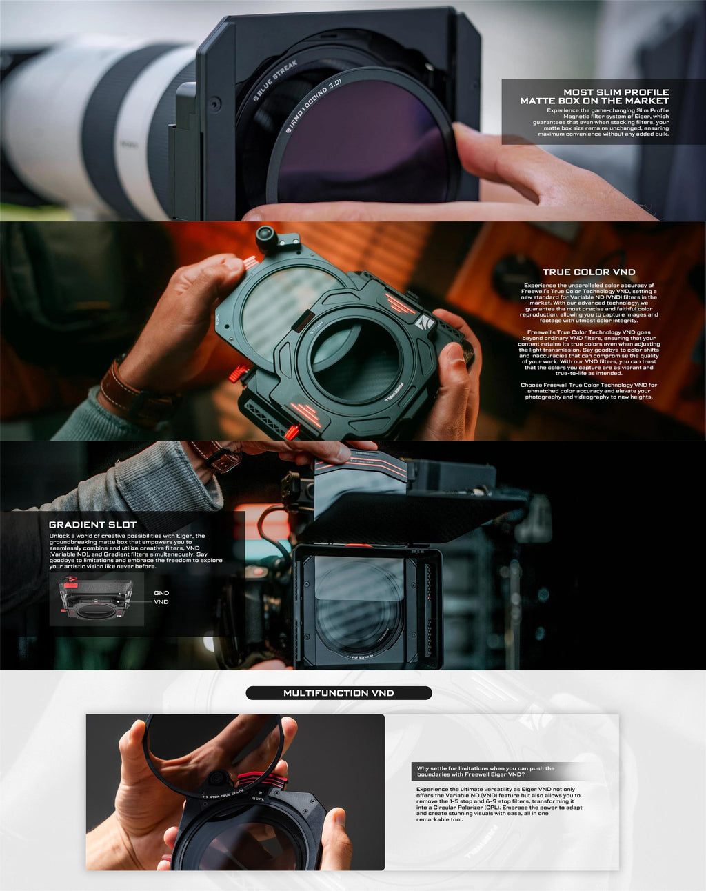 Eiger Matte Box: All-in-one including VND, Snow Mist, Blue Streak & GND system with pro optics, glare control, and lens compatibility up to 95mm.