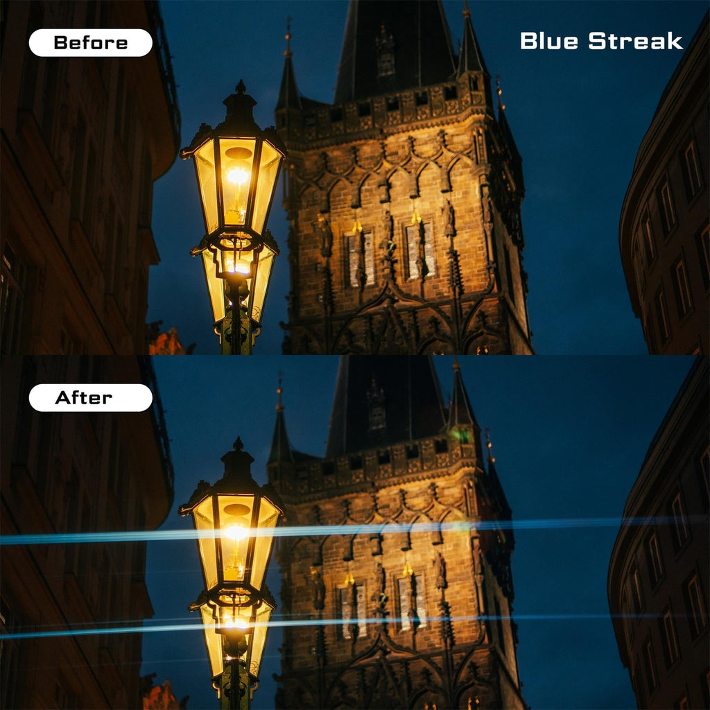 - Why Blue Streak? Blue Streak Filter is designed to produce a unique special effect where a single light ray originating from a point source is transformed into elongated blue streaks extending horizontally from the light source.