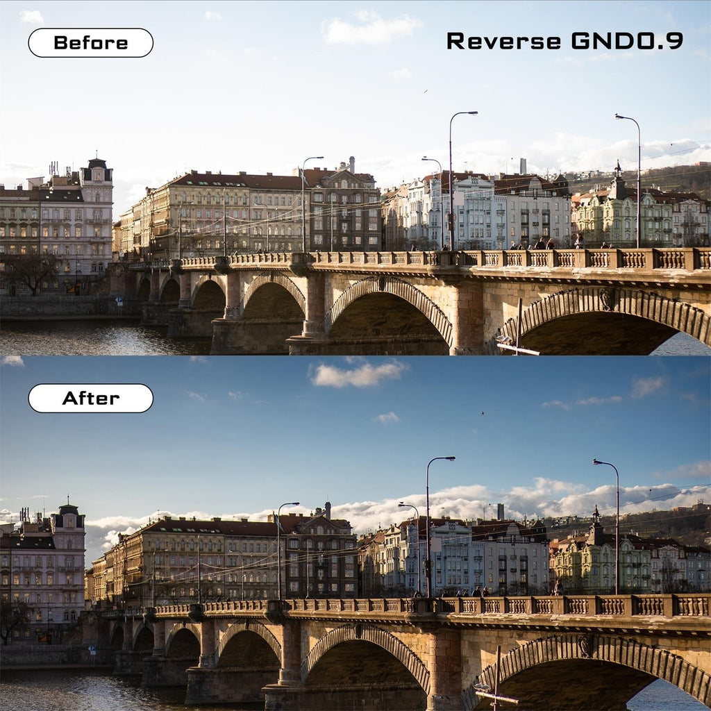 - Why Reverse Edge Gradient? Engineered for sunrise and sunset shots, the Reverse GND0.9 filter darkens the horizon while preserving foreground detail, delivering rich, balanced images with vibrant tones and minimal overexposure.