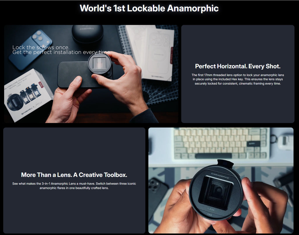 - 1.33x anamorphic lens captures cinematic 2.35:1 widescreen shots with natural oval bokeh and horizontal flares for a true Hollywood look