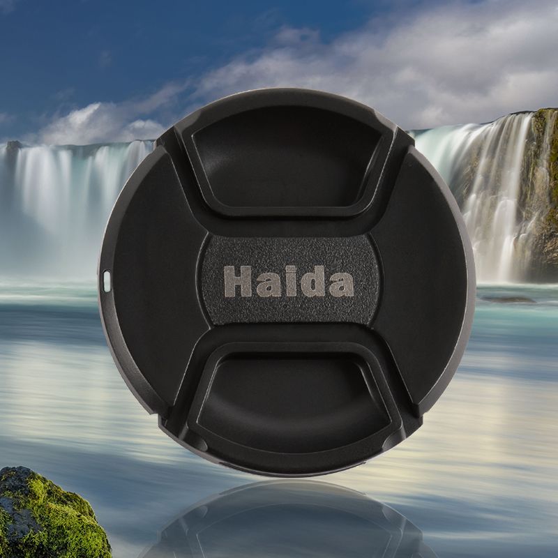 A front lens cap with a center pinch, spring, and snap-on mechanism. It is easy to put on and take off, and it stays on. Lens caps protect the front element of a lens from scratches, fingerprints, and the elements when the lens is not in use. It's always good to have a spare in your camera bag, too.