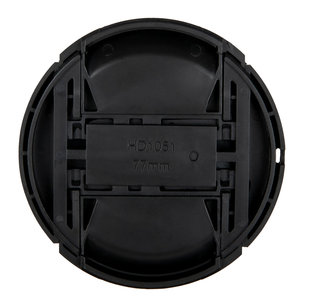 A front lens cap with a center pinch, spring, and snap-on mechanism. It is easy to put on and take off, and it stays on. Lens caps protect the front element of a lens from scratches, fingerprints, and the elements when the lens is not in use. It's always good to have a spare in your camera bag, too.