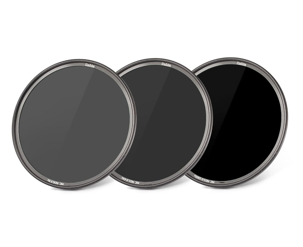 Including three 77mm multi-coated ND filters, the Haida Ultimate Long Exposure Set Slim PROII ND Filter Kit also includes a 72-77mm step up ring and a zippered hard case. You can use these filters on a lens with a 77mm threaded front, or with a lens with 72mm front threads using the included step-up ring. The included 3-, 6-, and 10-stop filters are exceedingly thin, allowing you to stack multiple filters without vignetting. Each filter is threaded front and back.
