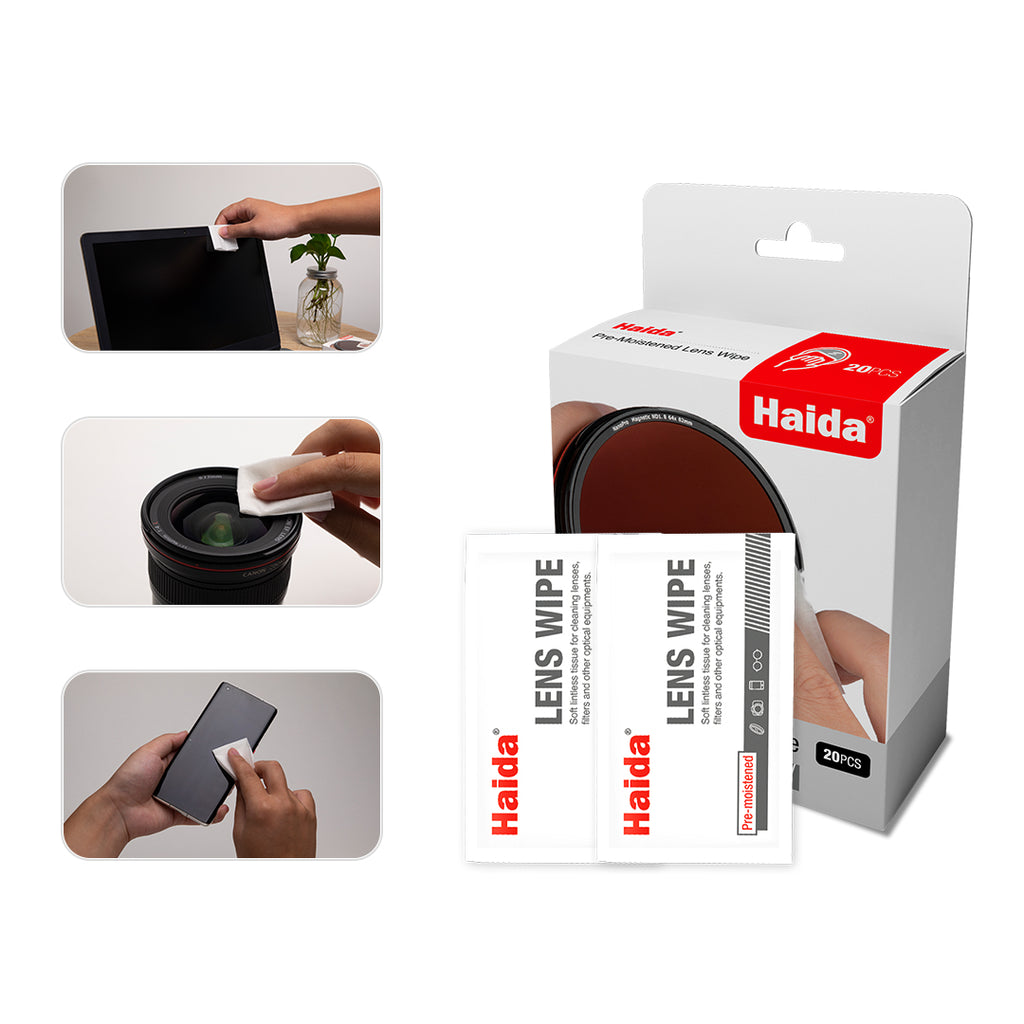 Haida Pre-Moistened Lens Wipe Set contains 20 individually wrapped wipes, which is tidy to use and portable to carry. The material of Pre-Moistened lens wipe is wet strength paper with a special cleaner without alcohol. Hence, you will get a flawless lens after cleaning by Haida wipe and don’t be afraid of alcohol in security check when go outside. Besides, the size is enough for most lenses, including ultra-wide angle lenses.