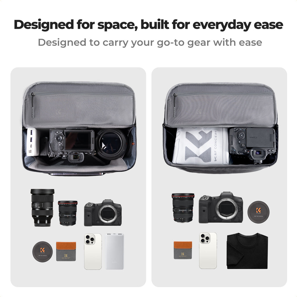 Fits accessories such as lenses, filters, batteries, power banks, mobile phones, wallets, and small clothing items.