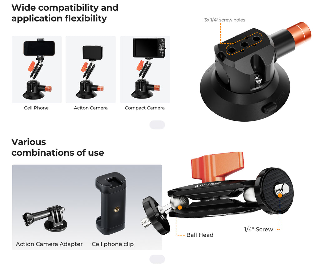 K&F CONCEPT 3" SUCTION CUP CAMERA MOUNT WITH MAGIC ARM