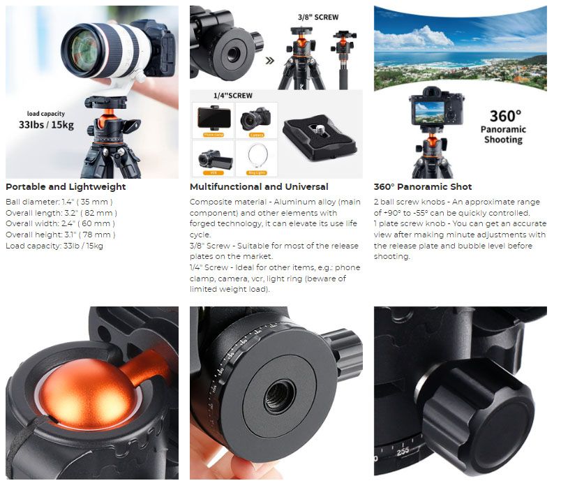 - 35mm Large Ball Head for Stable Shooting & Greater Load Capacity of 15kg/33lbs - Large spheres are more stable. This tripod head is made of highly resistant, lightweight aluminum, so it is both portable and strong enough to cope with a payload capacity of up to 15kg/33lbs.