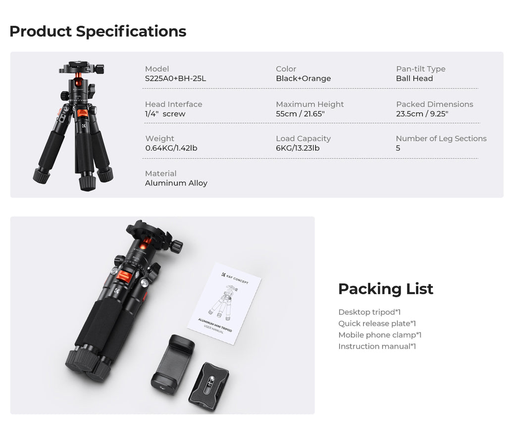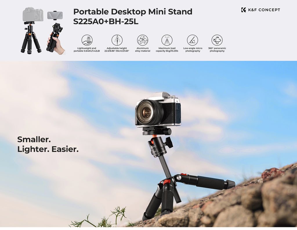K&F CONCEPT 55CM FOLDING ALUMINUM ALLOY TABLETOP MINI TRIPOD WITH BH-25L BALL HEAD