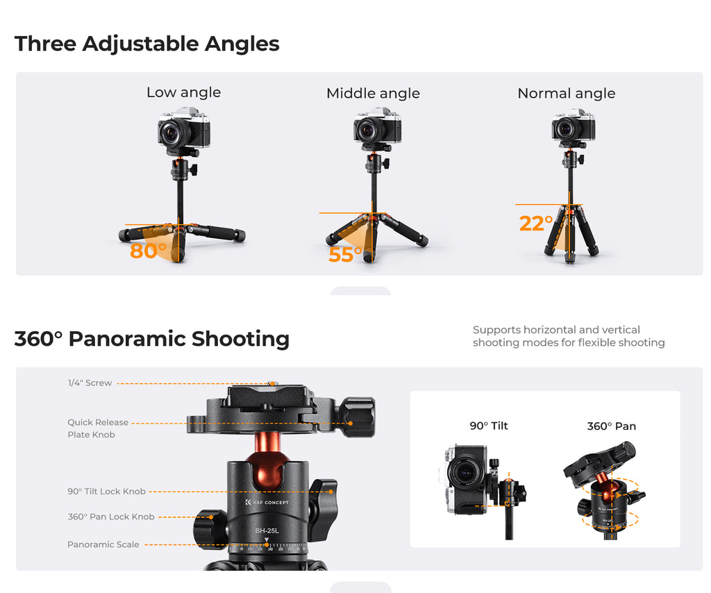 - Three adjustable leg angles (22°, 55°, 80°) for normal, middle, and low-angle photography