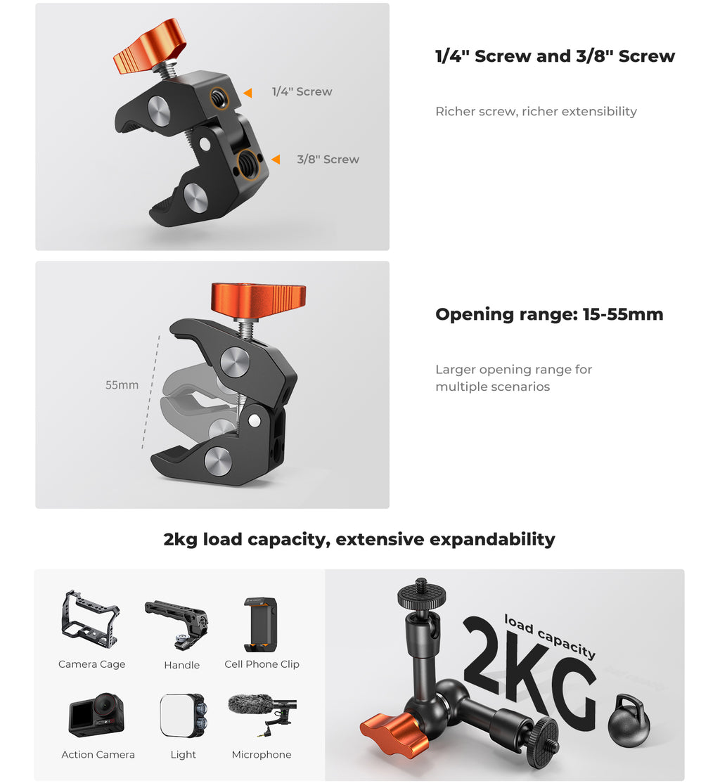 -Sturdy super clamp mounts on poles, posts, tripods, tables, desks, bike/motorcycle handlebars