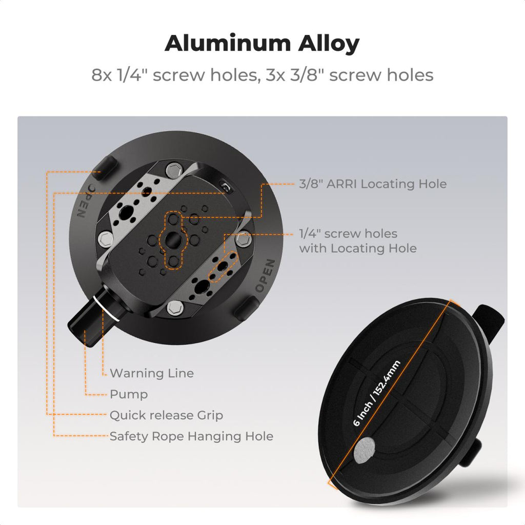 - Strong Adsorption: Equipped with a 6" (152.4mm) air pump vacuum suction cup that provides powerful suction and stable attachment on smooth, non-porous surfaces such as car glass, hoods, tiles, or tabletops.