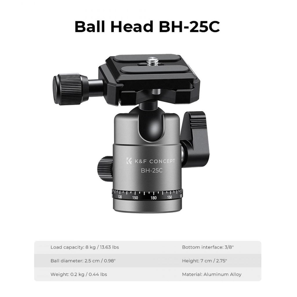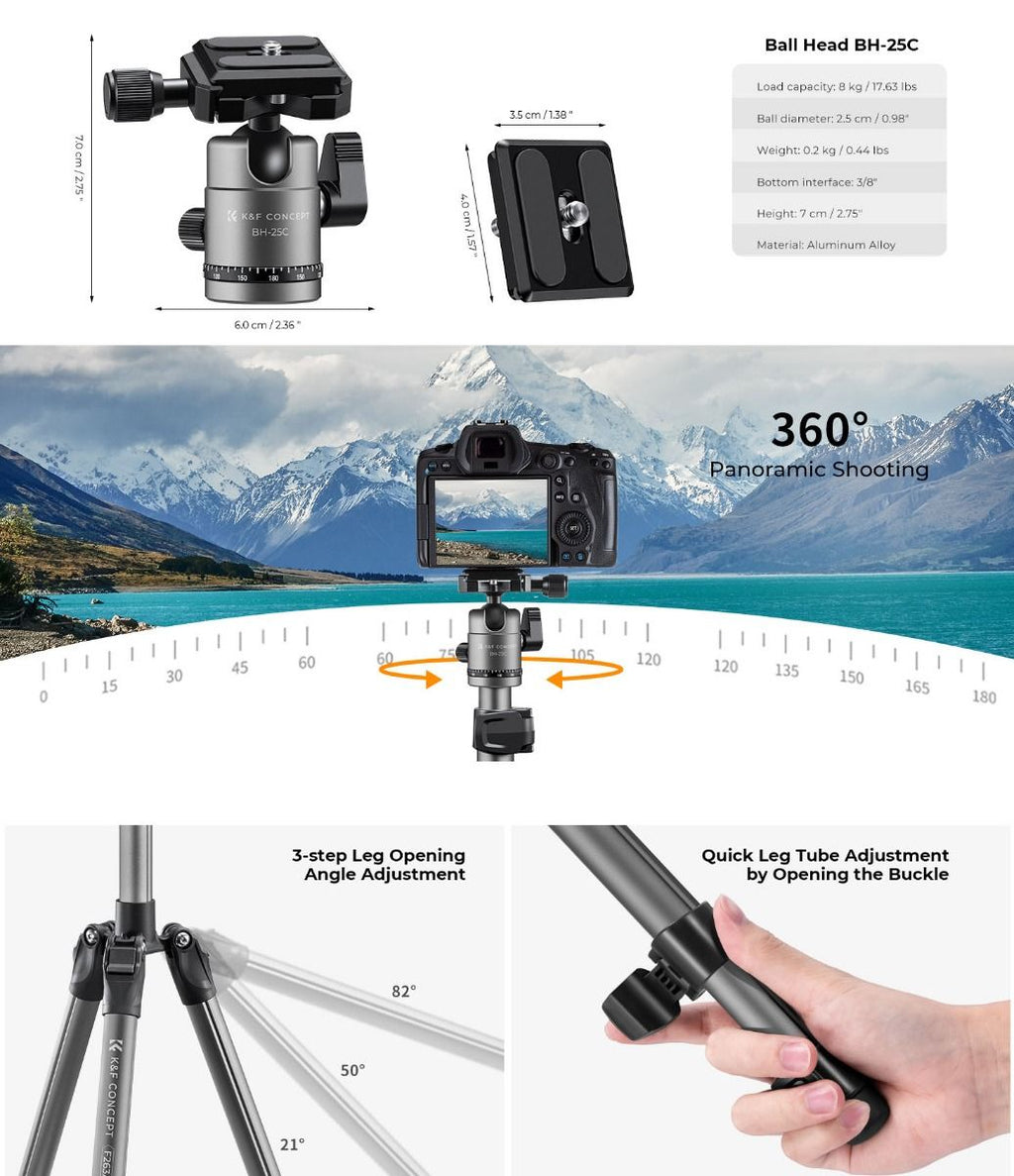 - 360°Panoramic CNC Metal Ball Head - K&F Concept exclusive 25mm metal ball head provides a safe bearing capacity of 8kg/17.6lbs,the oil-free damping design can meet the needs of extremely smooth 360°panoramic shooting;CNC process anodized for better wear and corrosion resistance.