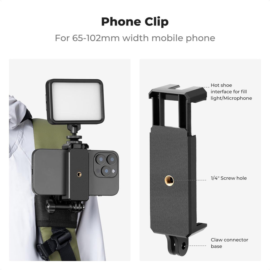 - Quick Install & Easy Use: Simply attach the action camera or phone clip to the mount, secure it to your shoulder strap, and adjust for the desired angle. Quick-release J-type buckle enables fast device swapping.