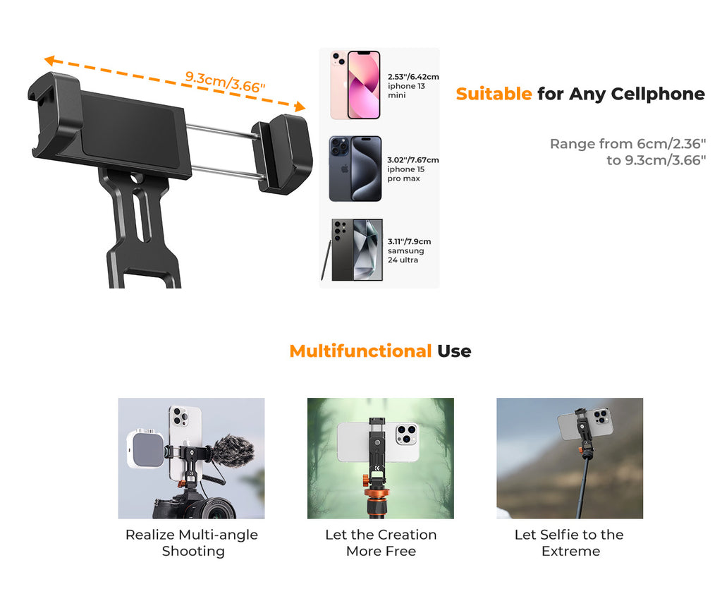 - Universal Fit: Adjustable clamp fits phones from 60mm–93mm wide (2.36–3.66in), including iPhone 15/14/13 series, Samsung S24/S23 Ultra, Pixel 8/7, etc. Non-slip silicone padding protects devices.