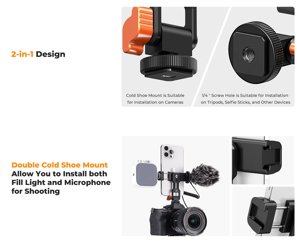 - Double Cold Shoe Design: Two adjustable cold shoe mounts for attaching microphone and fill light simultaneously.