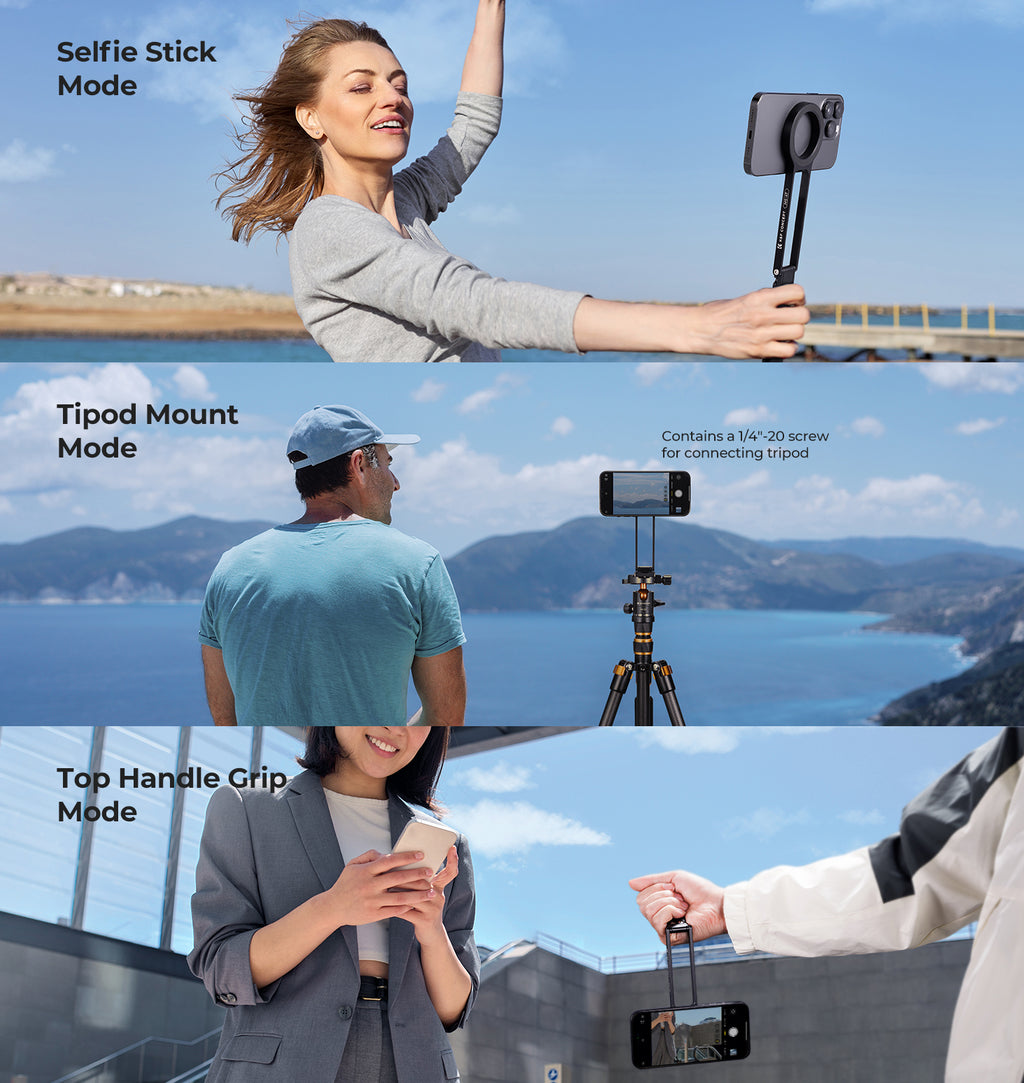 - Multi-Mode Functionality: Easily switch between tripod, selfie stick, handheld, and hanging (mantis) modes. Supports both horizontal and vertical shooting.