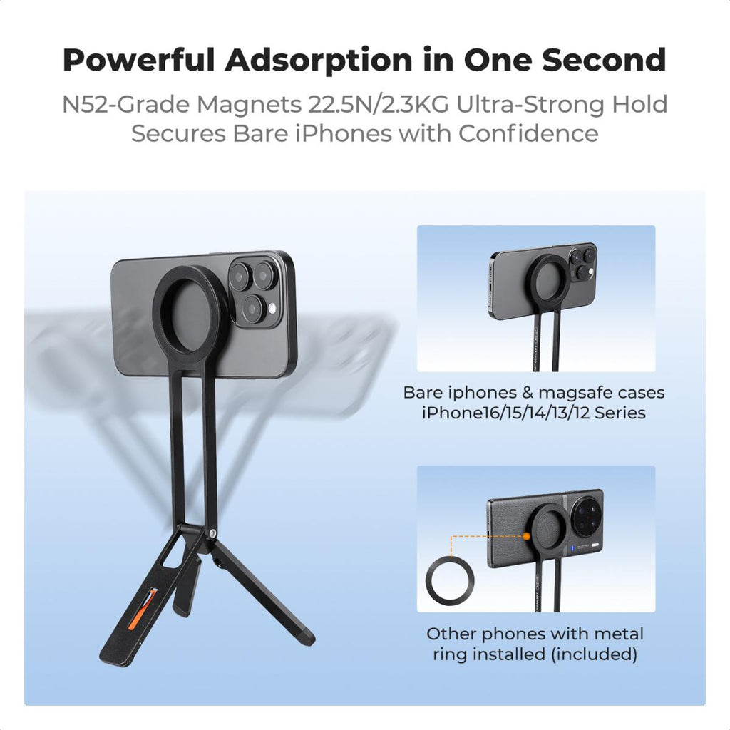 - 1-Second Magnetic Attachment: Features N52-grade magnets with 22.5N/2.3kg ultra-strong holding power for a secure connection to MagSafe iPhones or phones with the included metal ring.