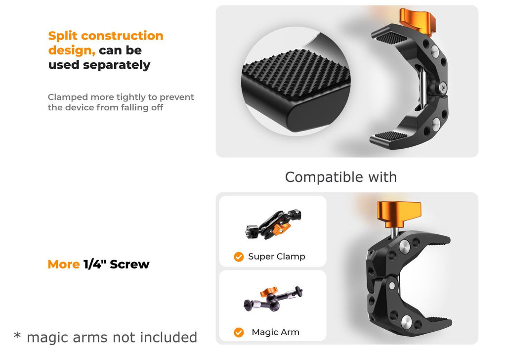 - The clamp also has a large number of 1/4" screw holes designed to facilitate use with various adapters and magic arms to achieve a variety of creative shooting functions and angles to meet your needs for different shooting scenes.