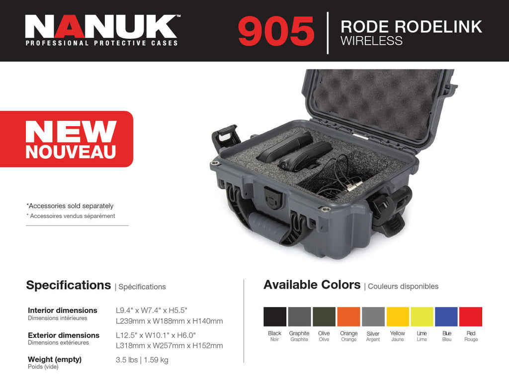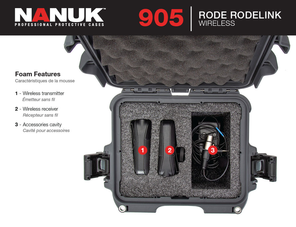 This compact media case comes with custom-cut high-quality closed cell foam for your RodeLink™ wireless kit. It offers compartmentalized protection specifically for a receiver and a transmitter. A large cavity offers plenty of space for accessories. Professionals and enthusiasts around the world trust NANUK to protect their most valuable gear, no matter what the conditions.