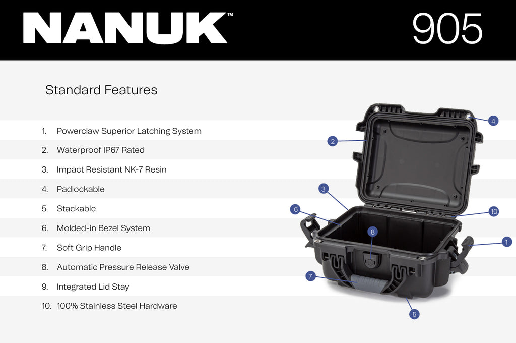 Perfect to organize, protect and carry your bulkier but still compact items, the NANUK 905 waterproof hard case is impenetrable and indestructible with a lightweight, tough resin shell and double side-mounted PowerClaw superior latching system.