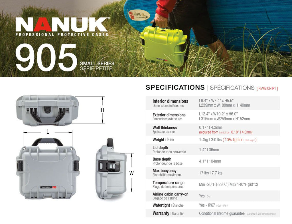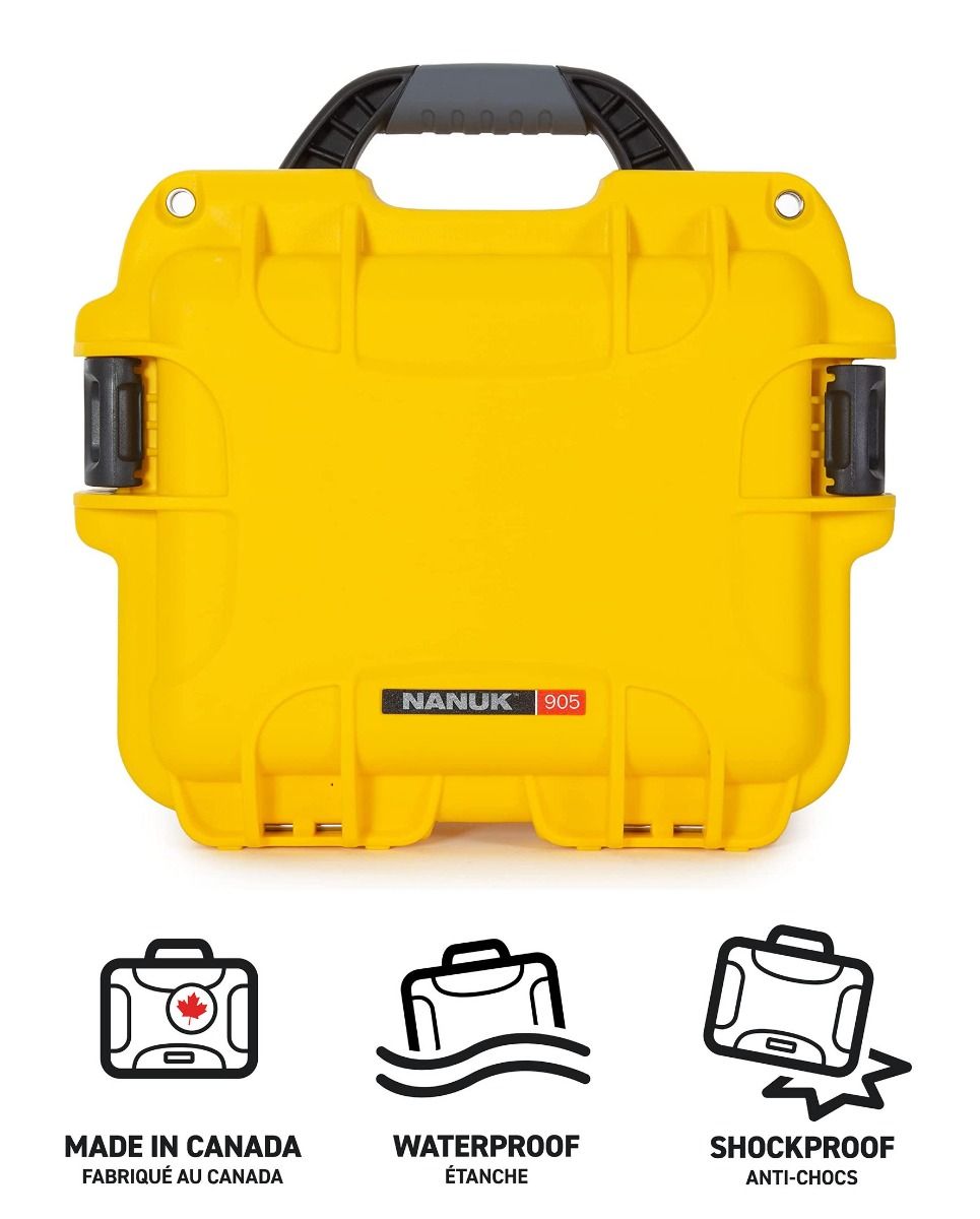 With NANUK’s exclusive locking and latching system, your case stays shut and secuYellow until you are ready to open it. Waterproof, dustproof, and indestructible, the NANUK 905 is ideal for batteries, lenses, smartphones, flash drives, hard drives, cameras, microphone systems, pistols, fishing gear, binoculars, scopes, tools or any other smaller personal or professional equipment that might need superior protection.