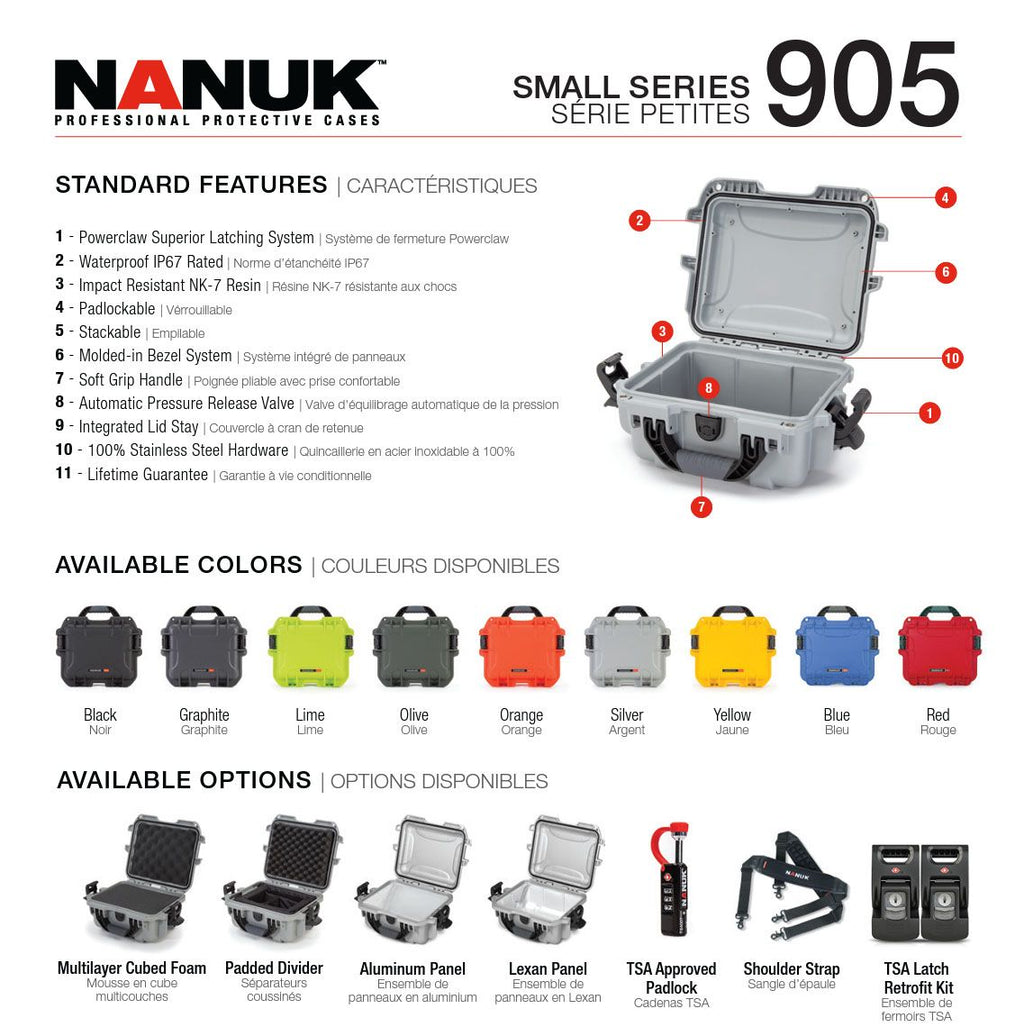 Perfect to organize, protect and carry your bulkier but still compact items, the NANUK 905 waterproof hard case is impenetrable and indestructible with a lightweight, tough resin shell and double side-mounted PowerClaw superior latching system.