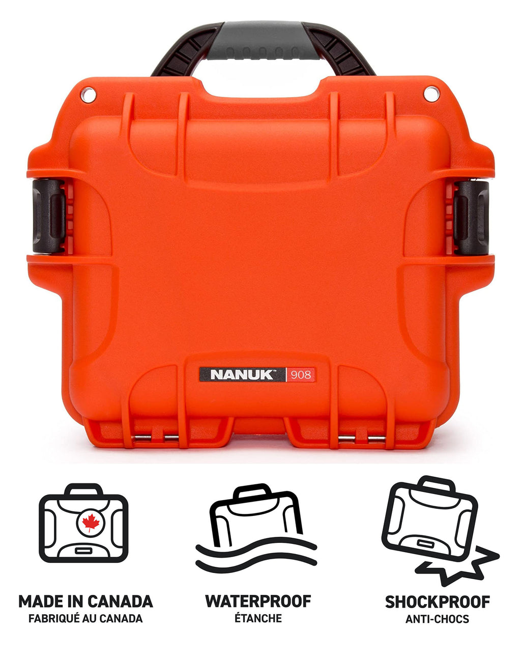 With NANUK’s exclusive locking and latching system, your case stays shut and secuOrange until you are ready to open it. Waterproof, dustproof, and indestructible, the 908 is ideal for camera/video gear, batteries, lenses, flash drives, hard drives, microphone systems, pistols, fishing gear, binoculars, scopes, medical devices, instrumentation, industrial tools or any other small to medium personal or professional equipment that might need superior.