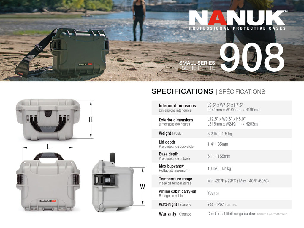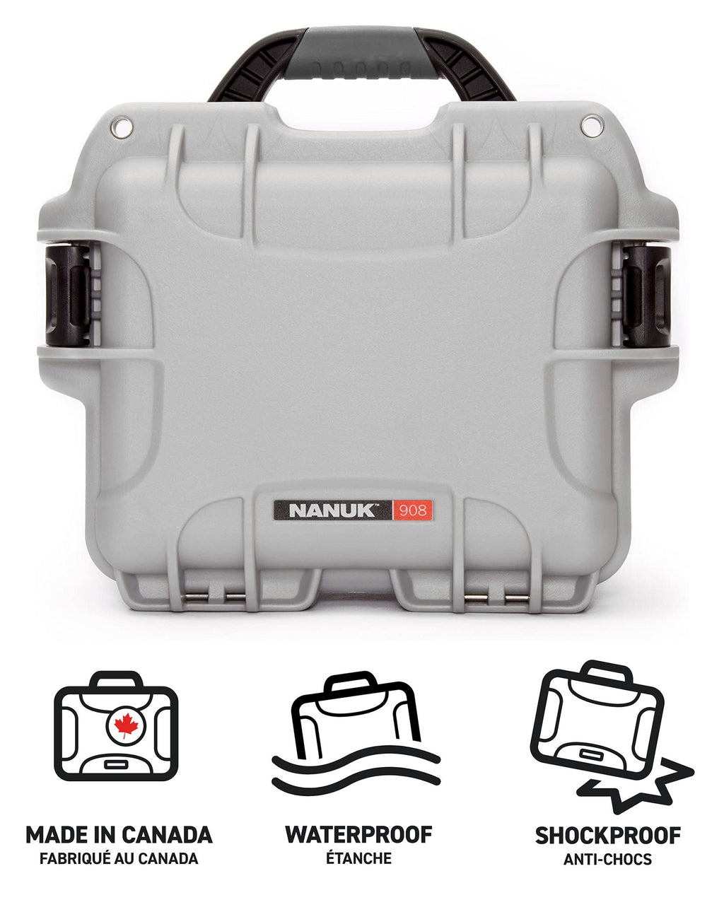 With NANUK’s exclusive locking and latching system, your case stays shut and secuSilver until you are ready to open it. Waterproof, dustproof, and indestructible, the 908 is ideal for camera/video gear, batteries, lenses, flash drives, hard drives, microphone systems, pistols, fishing gear, binoculars, scopes, medical devices, instrumentation, industrial tools or any other small to medium personal or professional equipment that might need superior.
