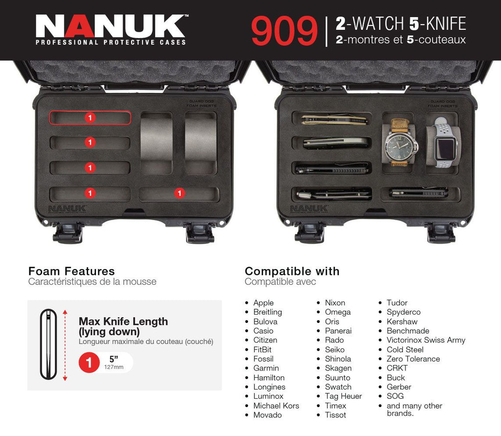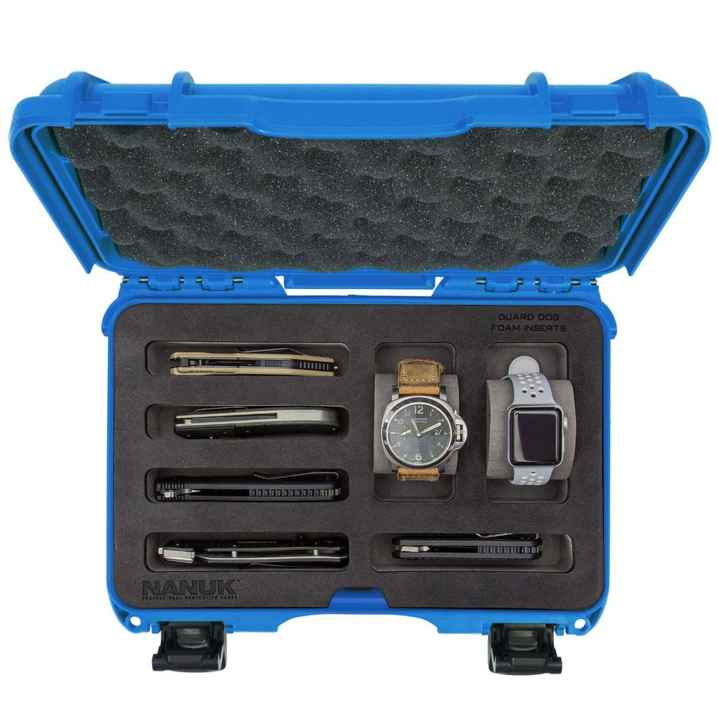 Designed to hold 2 watches and 5 single-blade folding knives, the NANUK 909 2-Watch 5-Knife Case is indestructible and built to protect and secure your collection. The protective high-quality Cross-Linked Polyethylene (XLPE) foam interior is pre-cut to hold up to 2 watches and 5 knives as long as 5" (closed) and up to 3" wide including pocket clip.