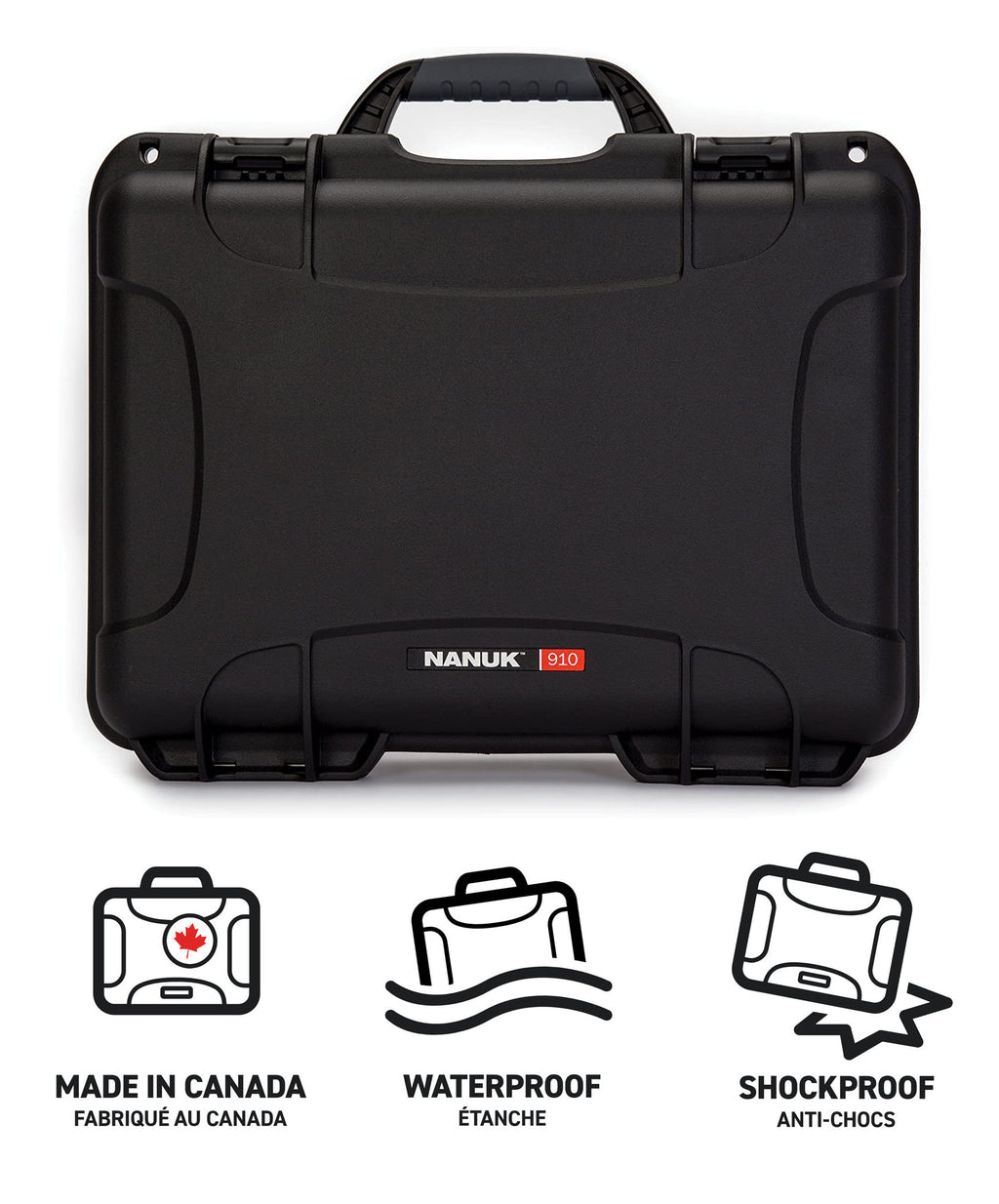 Built to organize, protect, carry and survive tough conditions, the NANUK 910 waterproof and dustproof hard case is impenetrable and indestructible with a lightweight tough NK-7 resin shell offering great shock absorption. With NANUK’s patented superior PowerClaw latching system, your case stays shut and secured until you are ready to open it.