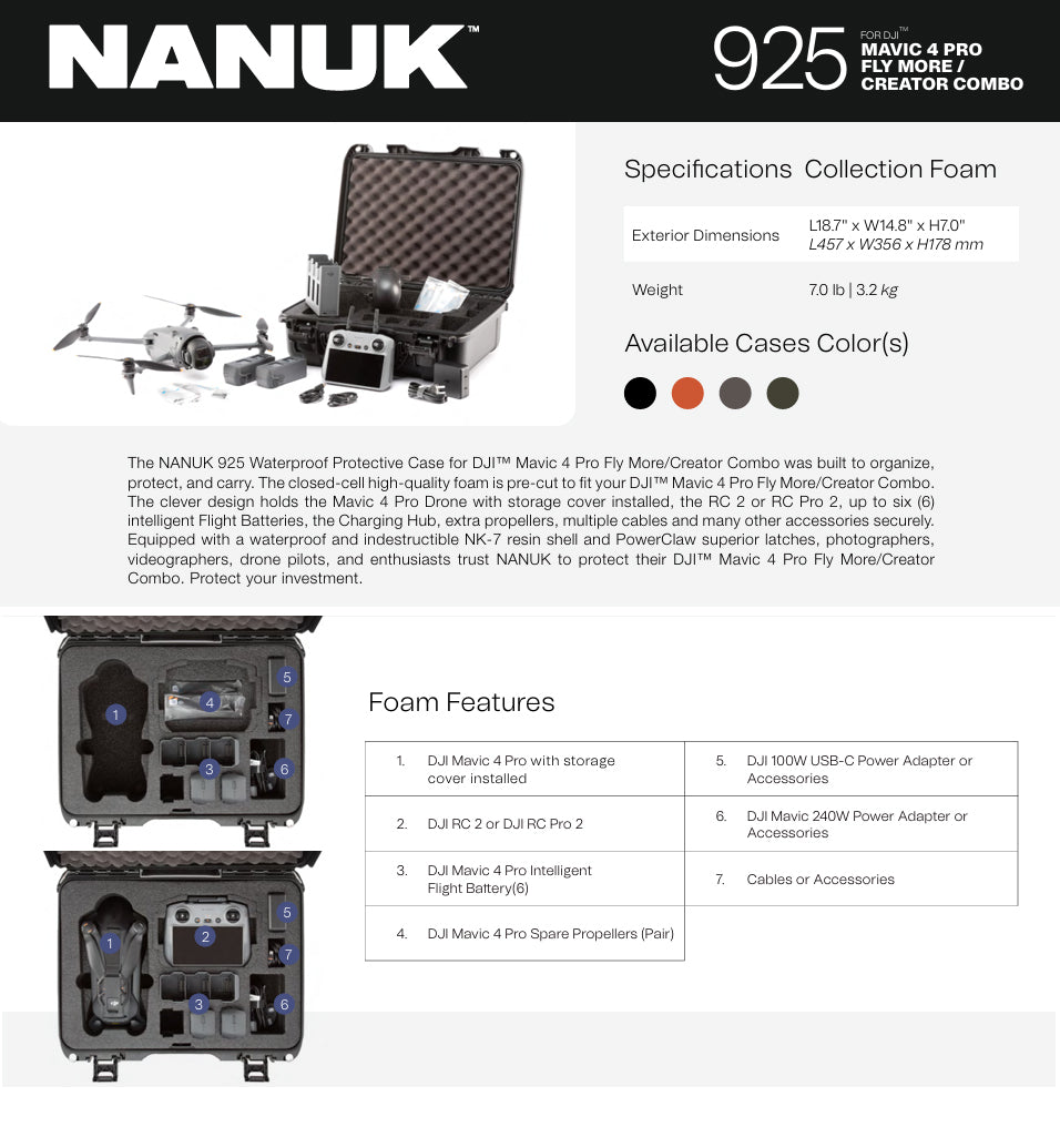 The NANUK 925 Waterproof Protective Case for DJI™ Mavic 4 Pro Fly More/Creator Combo was built to organize, protect, and carry. The closed-cell high-quality foam is pre-cut to fit your DJI™ Mavic 4 Pro Fly More/Creator Combo. The clever design holds the Mavic 4 Pro Drone with storage cover installed, the RC 2 or RC Pro 2, up to six (6) intelligent Flight Batteries, the Charging Hub, extra propellers, multiple cables and many other accessories securely.