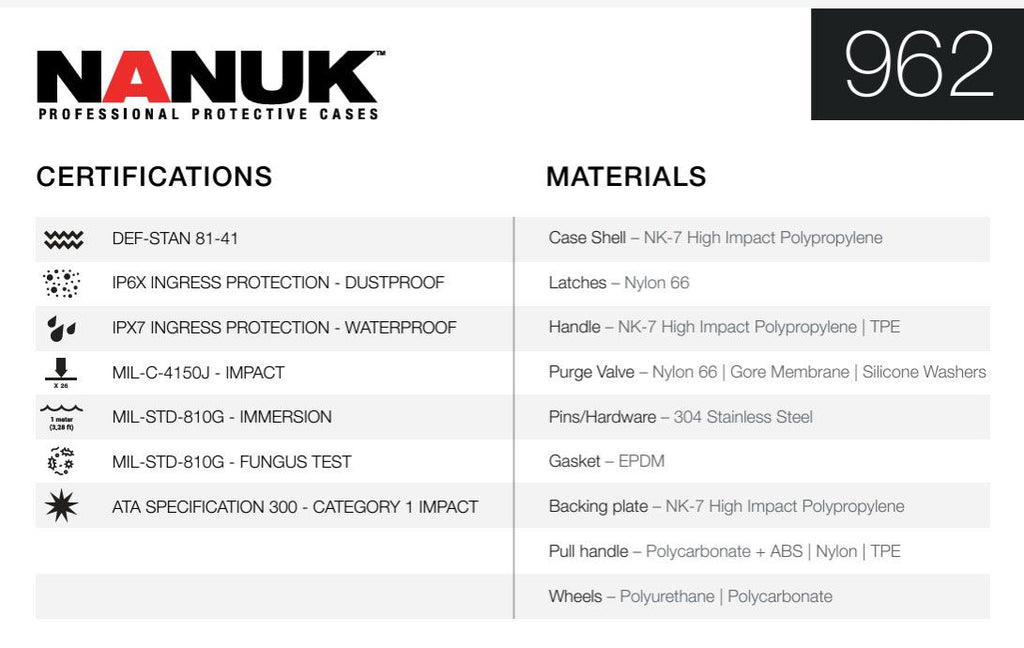 Like all NANUK waterproof protective cases, the 962 is made of crushproof NK-7 resin certified to withstand extreme impact and continuous vibration – in other words, it’s indestructible.