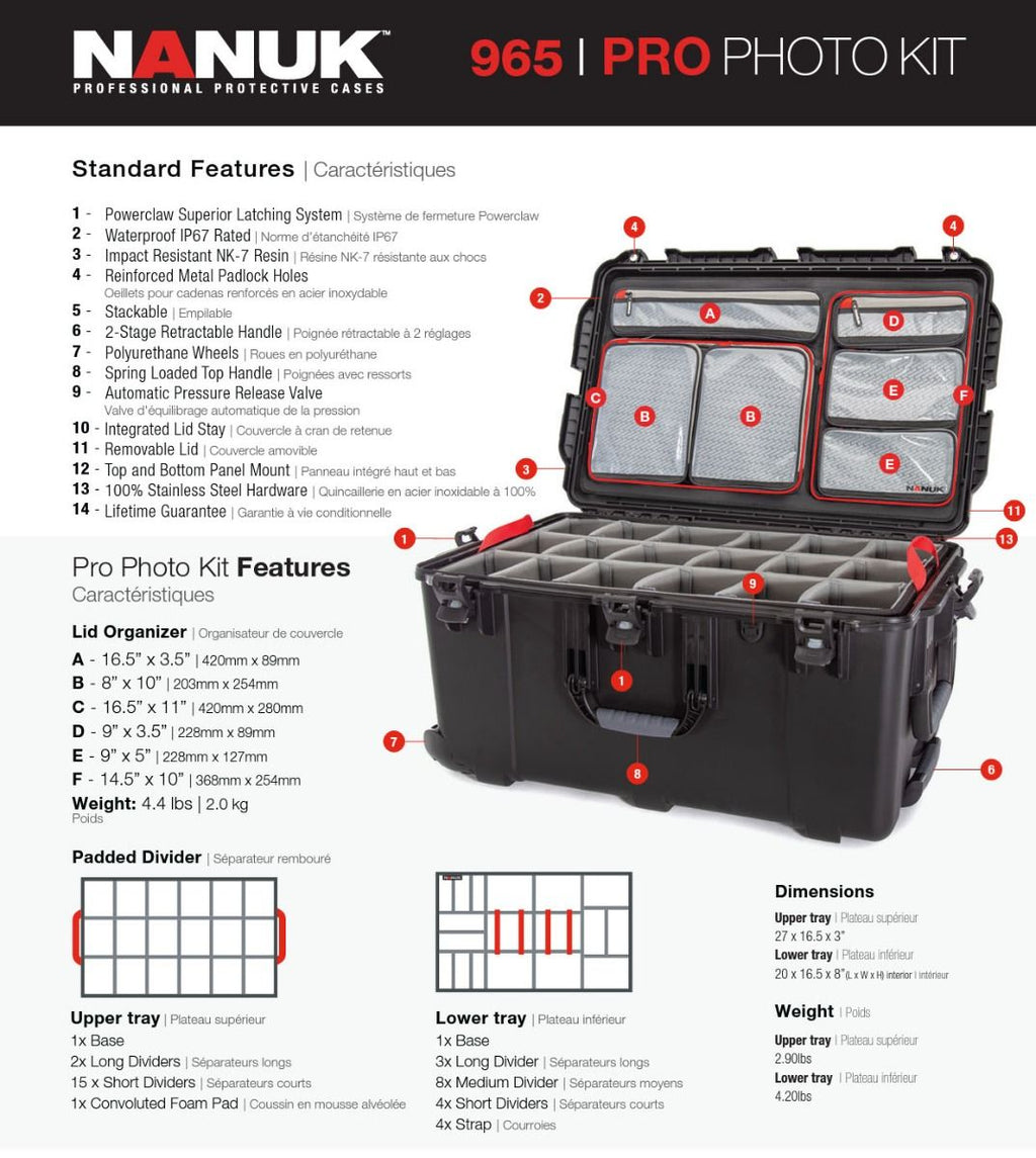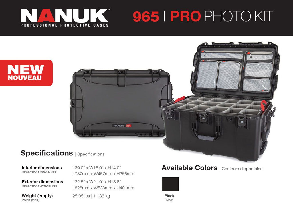 The NANUK™ 965 Pro Photo Kit is designed to offer compartmentalized protection and organization for all of your photographic gear and accessories.