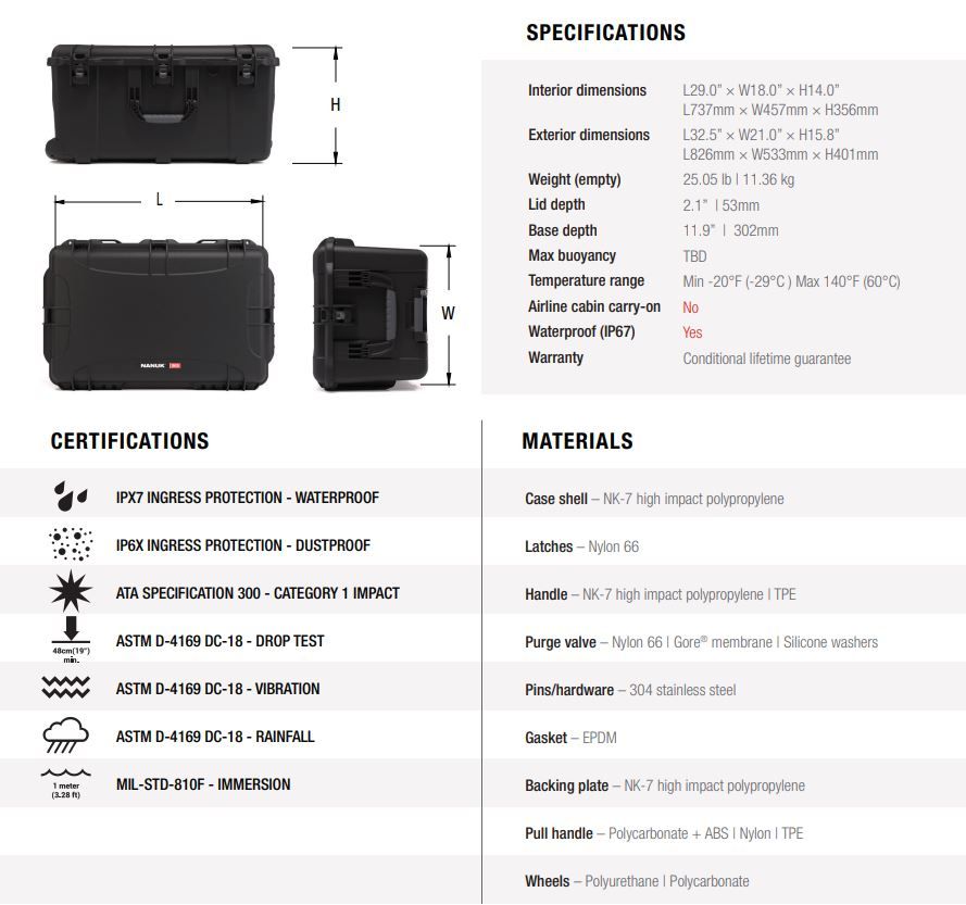 This waterproof hard case is impenetrable and indestructible with a lightweight, tough NK-7 resin shell and five (5) PowerClaw latches. With NANUK’s exclusive locking and latching system, your case stays shut and secured until you are ready to open it.