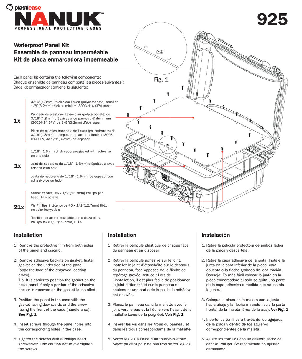 A Lexan panel kit can easily be added to any of the Nanuk cases thanks to the integrated bezel system. The Lexan panel kit is contoured by a 3/16″ thick polycarbonate panel with stainless steel mounting screws and an adhesive backed die-cut waterproofing gasket.
