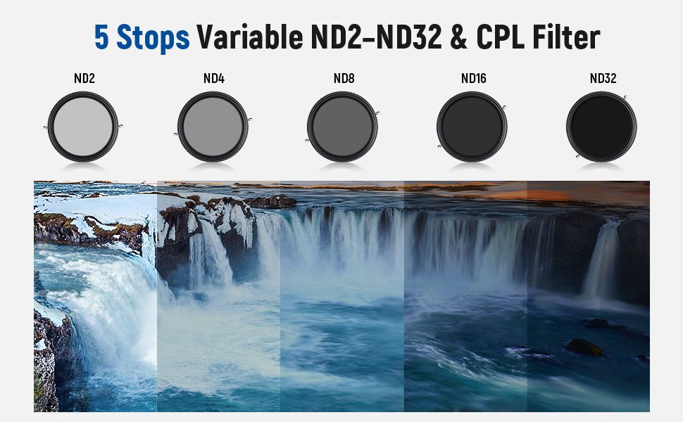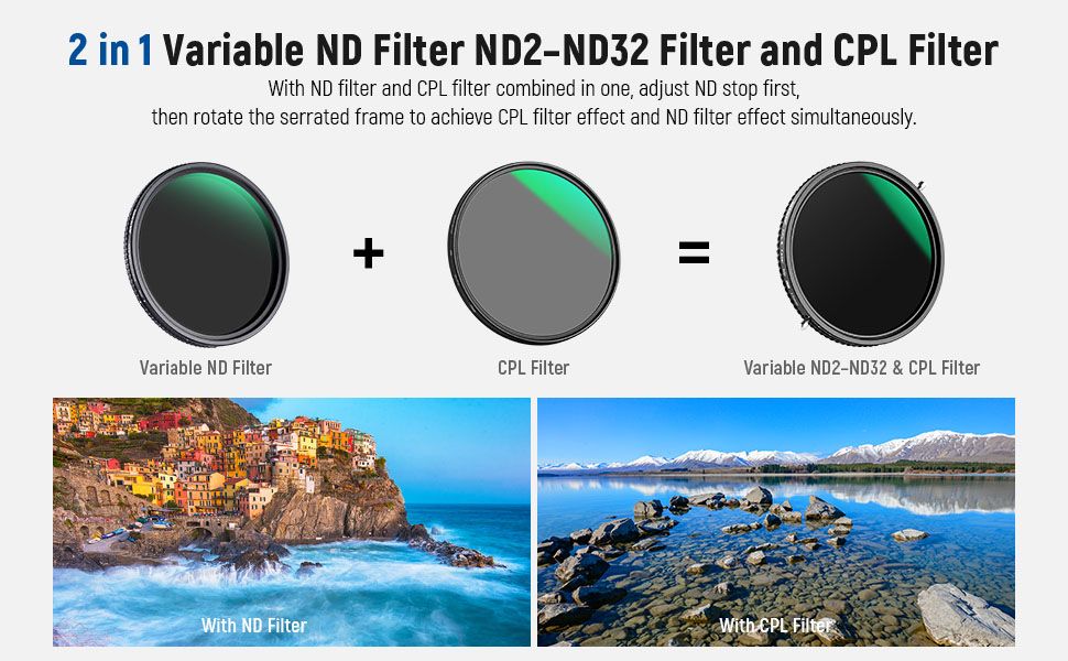 - Variable ND & CPL Filter: After adjusting the ND filter and then rotating the frame, you can realize the functions of the ND filter and the CPL filter simultaneously. This 2 in 1 filter kit allows you to shoot under bright lighting conditions to capture motion blur images. It reduces reflections and glare from shiny objects like water or glass. The variable neutral density filter reduces 1–5 stops of light