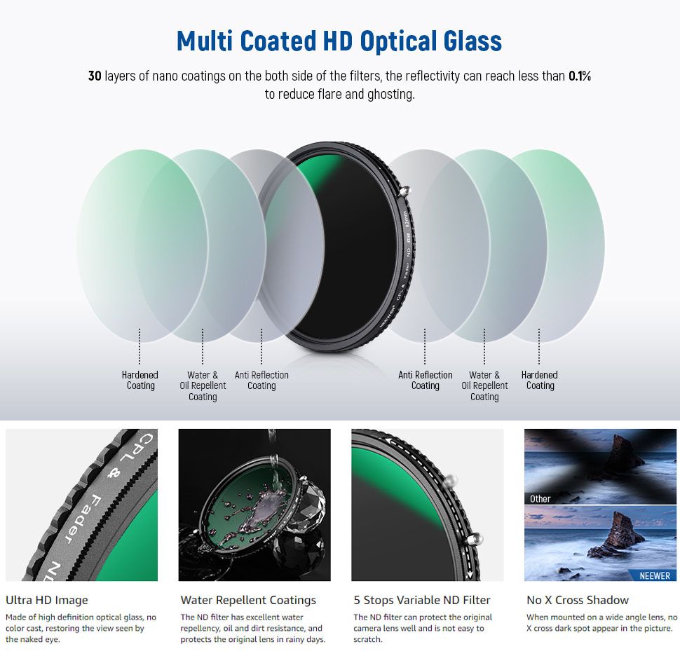 - HD Optical Glass with Multiple Resistant Coatings: With high quality HD optical glass and 30 layers of nano coatings on the both side of the filters, the reflectivity can reach less than 0.1% to reduce flare and ghosting. Protect the filter from water, oil, dust, and scratches