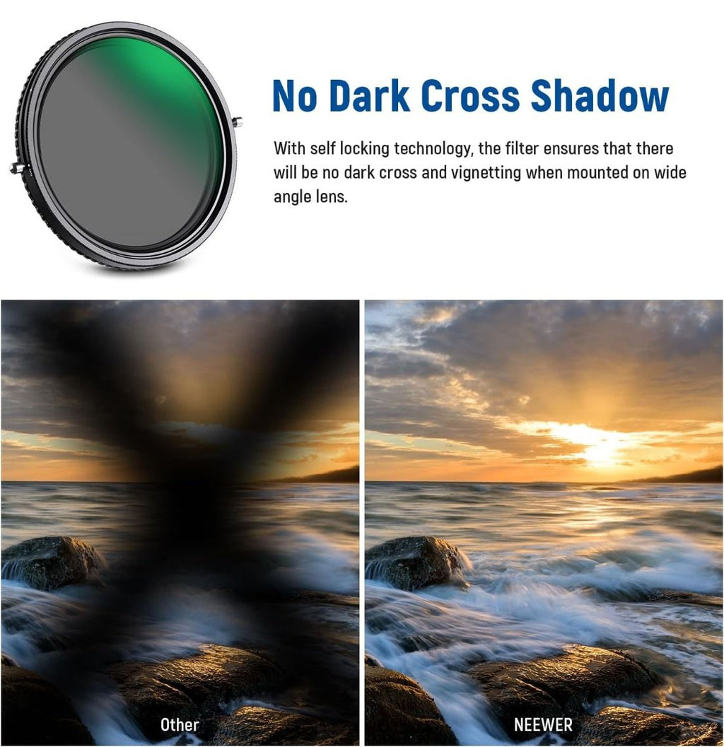 - No Dark Cross Shadow: To solve the well known vignetting issue with variable ND filters when used on wide angle lenses, the NEEWER filter set uses self locking technology to ensure that there will be no dark cross shadow or vignetting when shooting with wide angle lens