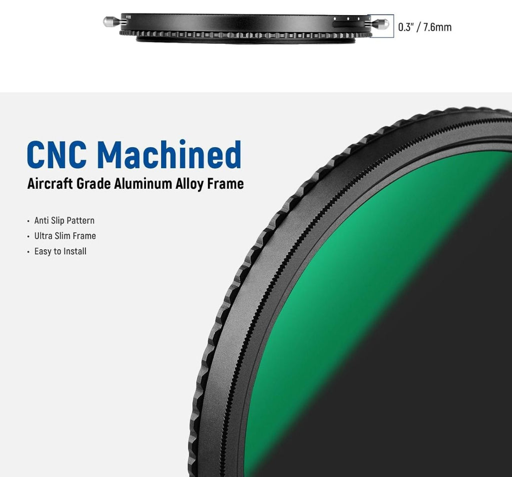 - Aircraft Grade Aluminum Alloy Frame: Made of CNC machined aluminum alloy, the non slip texture of the frame makes it easy to install and remove the filter. Laser etched marks can be precisely controlled from the minimum (ND2) to the maximum (ND32) of light reduction. Featuring ultra slim design, the front diameter is larger than the back diameter of this filter. Note: For this 82mm ND filter, the lens cap/hood (Sold Sperately) should be 86mm.