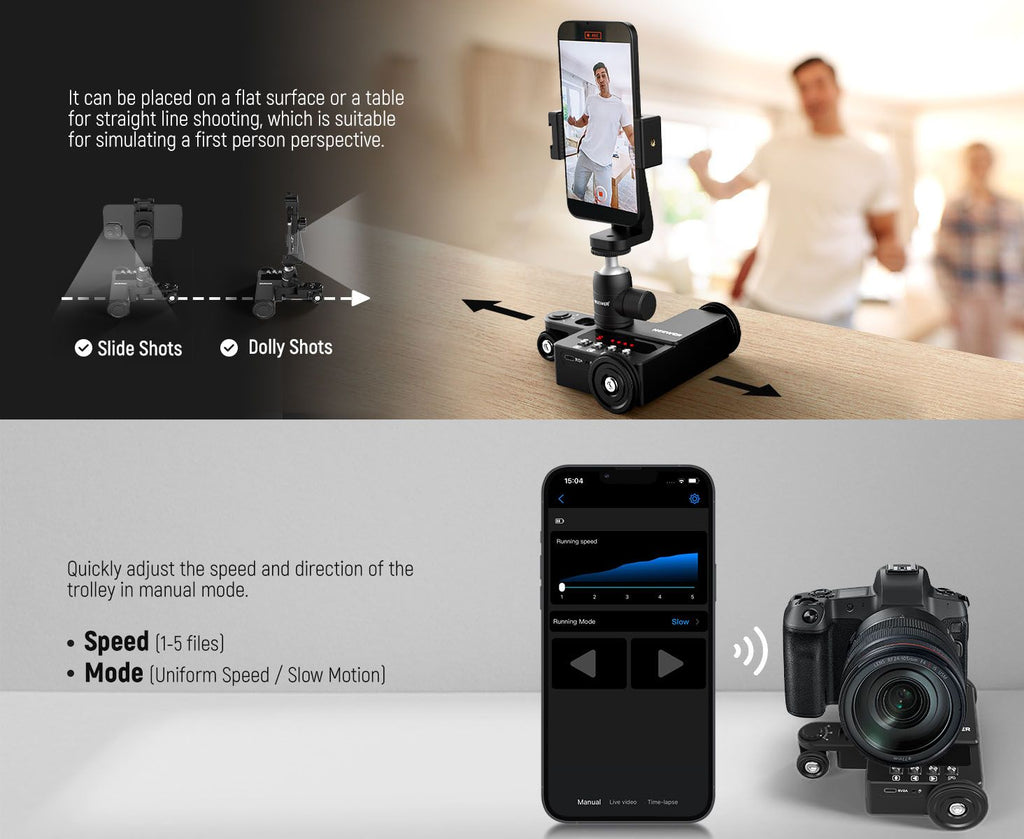 - Free Movement & 5 Speed Levels: The dolly can move smoothly straight and run side to side on even surfaces. You can operate the dolly in 5 speed levels by using the app. By manually angling the wheels, the dolly can achieve curved lines or move in circles. Different camera movements can help enhance your videos.