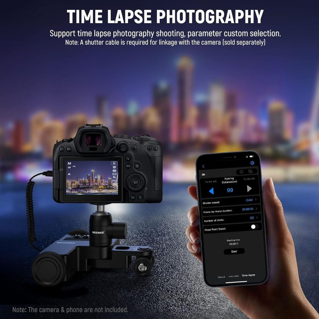 - Shooting Mode Customization: In Manual mode, you can set movement directions, speed (1–5 levels), and movement mode (even/slow). In Video mode, you can set movement directions, movement distance (66–999cm), and movement mode (even/slow). In Time Lapse mode, you can set shutter speed, frame length, number of shots, and fixed point shooting (Note: Time lapse photography needs a camera shutter cable and it is not included.)