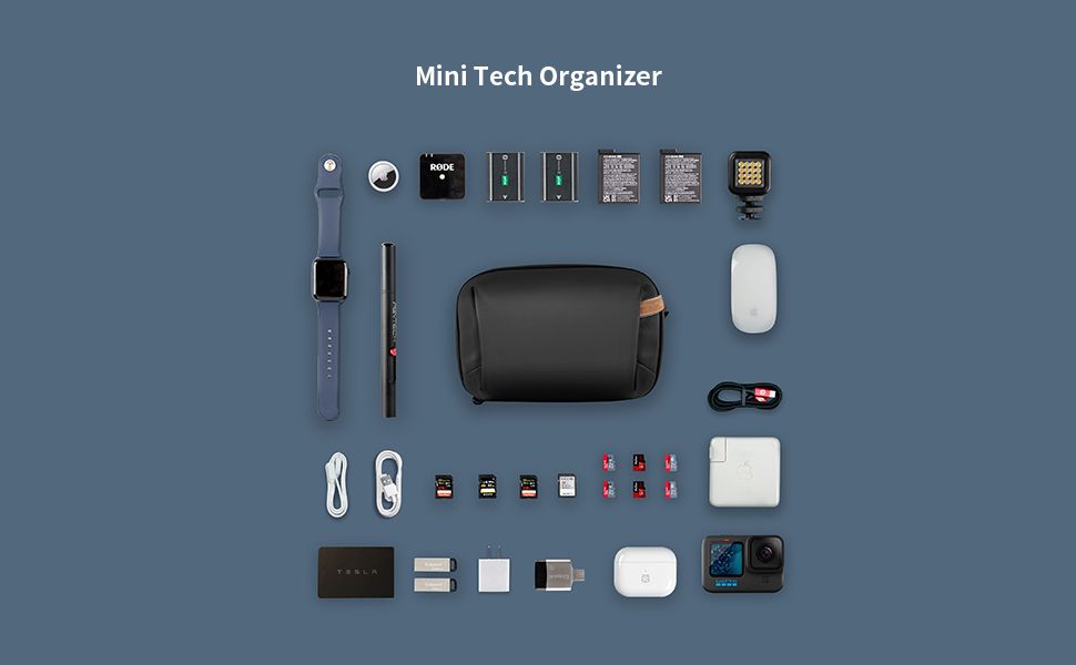 Mini Tech Organizer are designed for photography-lovers who want to keep all the accessories neatly organized. Scientific interior zoning including pockets for cards(TF*3,SD*4,ID*1), battery/ AirPods/ chargers as well as elastic bands and pen loops keep everything neatly organized. Premium splash-proof material, hidden AirTag pocket,YKK zipper and comfortable side handle make it versatile enough to satisfy diverse needs.