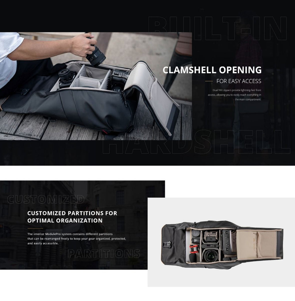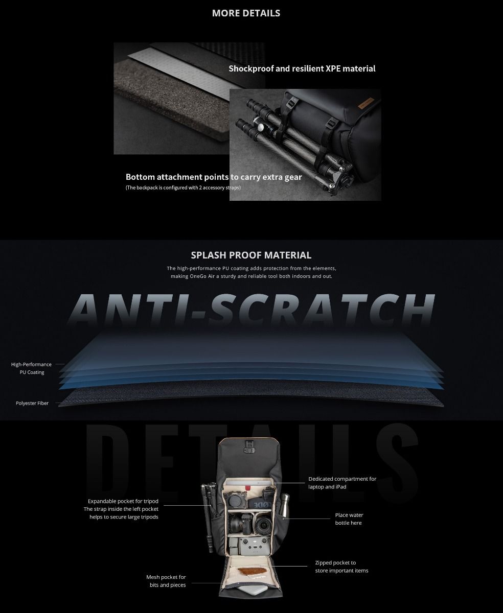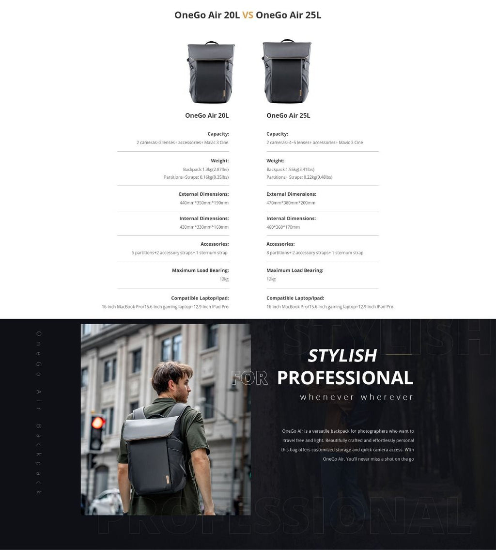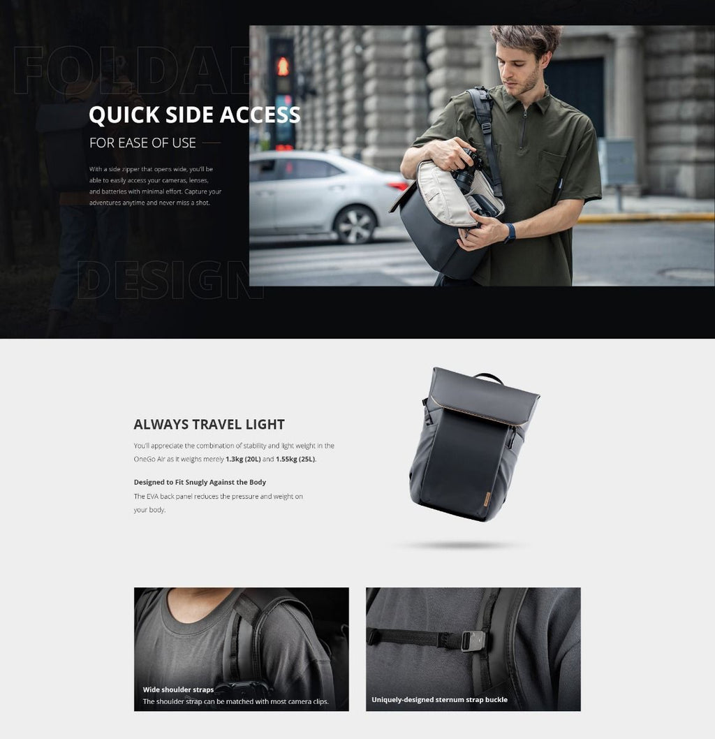 The OneGo Air 25L is a versatile backpack for urban photographers who want to travel free, light and chic. The backpack weighs merely 1.55kg, bringing a relaxing shooting experience.