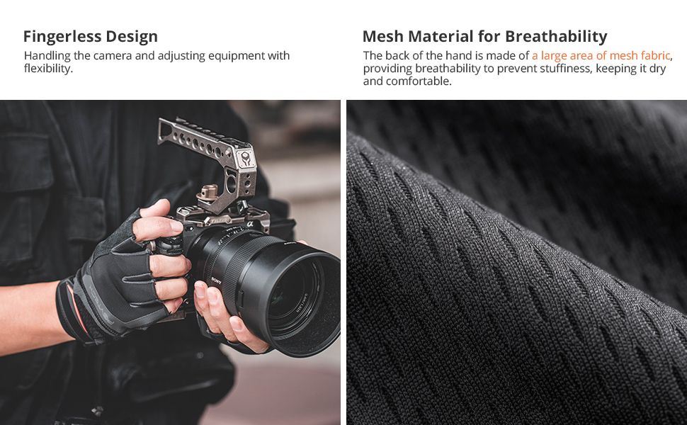 This product is a half-finger tactical photography glove designed to meet the needs of professional photographers during the spring and summer seasons, offering a grip for equipment handling or street photography. The glove features genuine leather for the palm, providing a non-slip and durable surface. The back of the hand is crafted with a large area of mesh fabric, ensuring enhanced comfort and breathability.