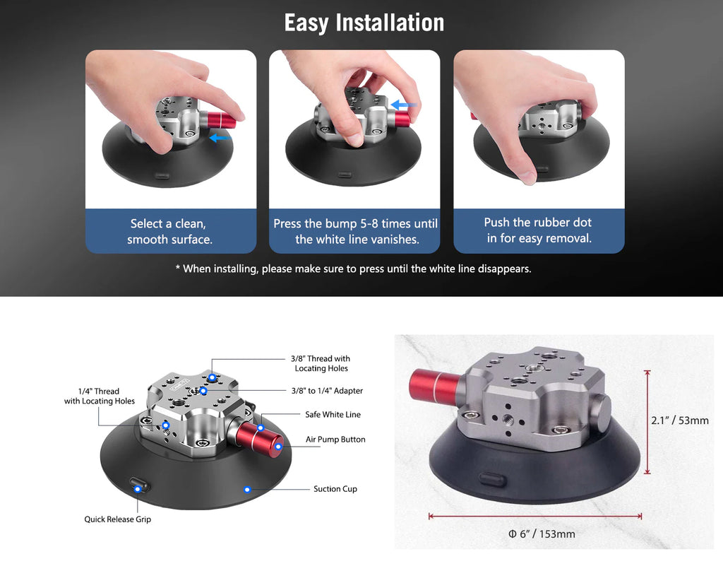 - Quick installation with air pump button for firm grip and rubber release tab for easy removal