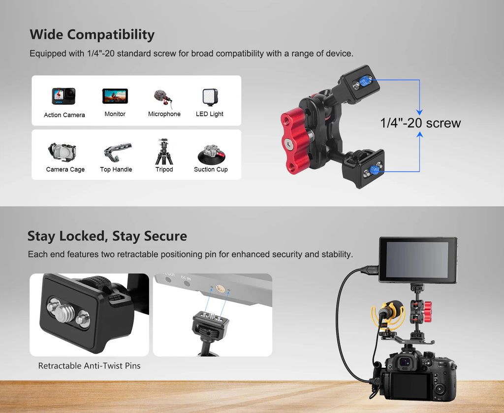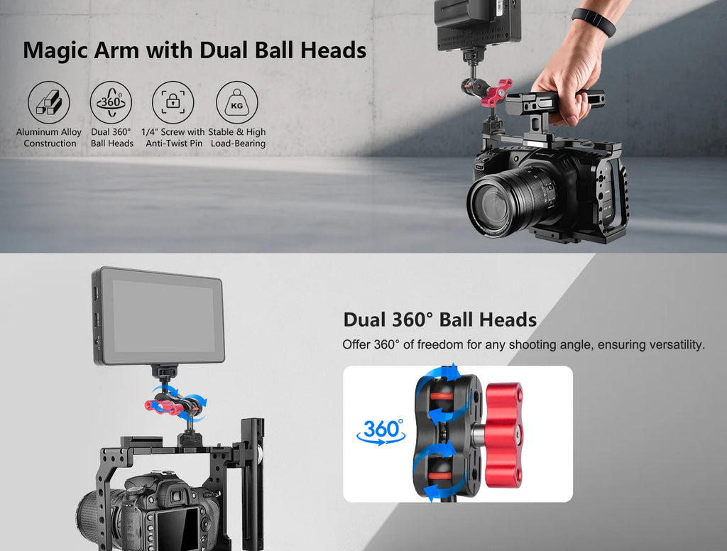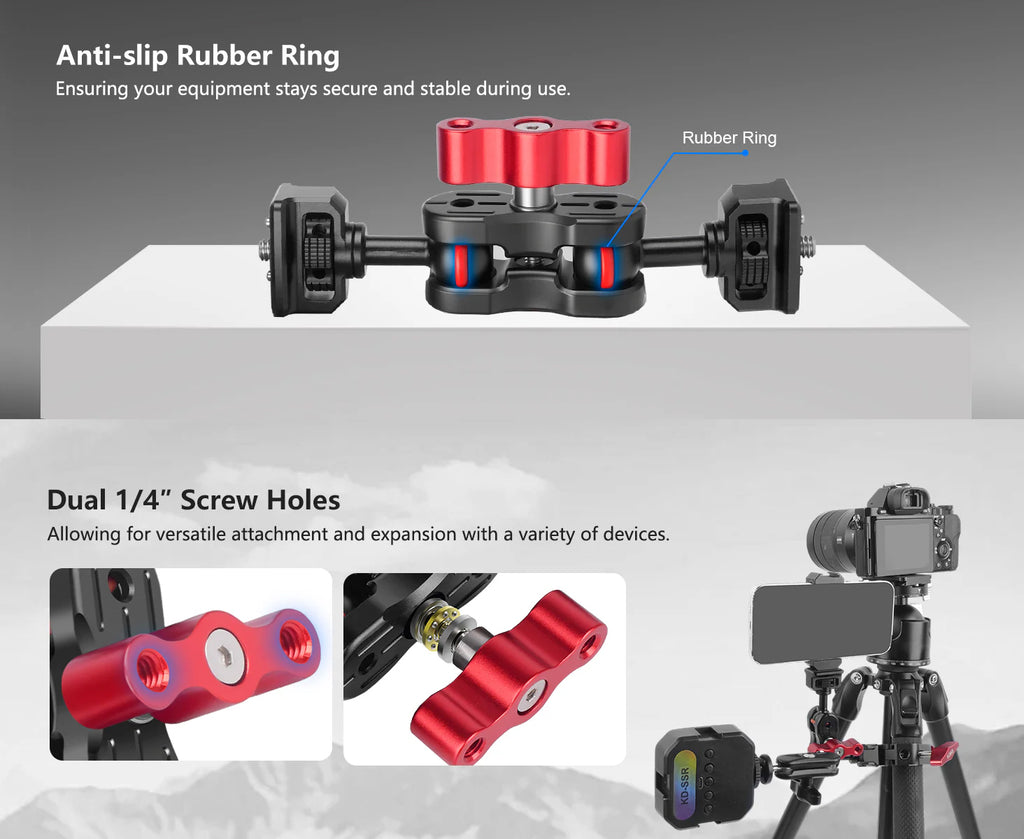 - Standard 1/4" Thread Holes, Strong Expandability: The magic arm is equipped with standard 1/4" screws at both ends, and the knobs also feature two 1/4" threaded holes, making it compatible with various devices. Its strong expandability allows you to create more possibilities during the shooting process.